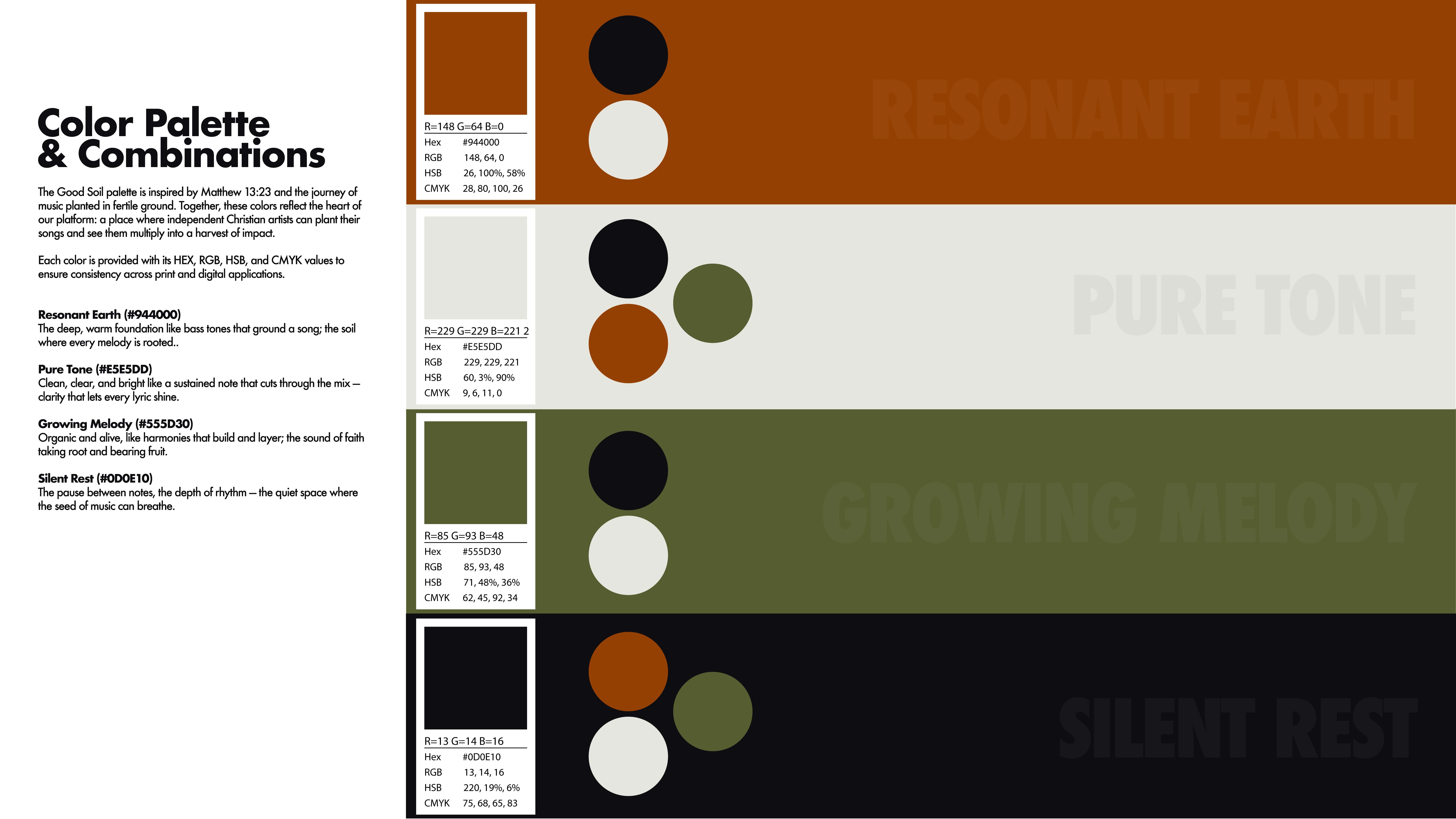 The result is a brand identity that feels timeless yet fresh, spiritual yet accessible, positioning Good Soil to serve as a trusted, collaborative home for independent Christian artists worldwide.