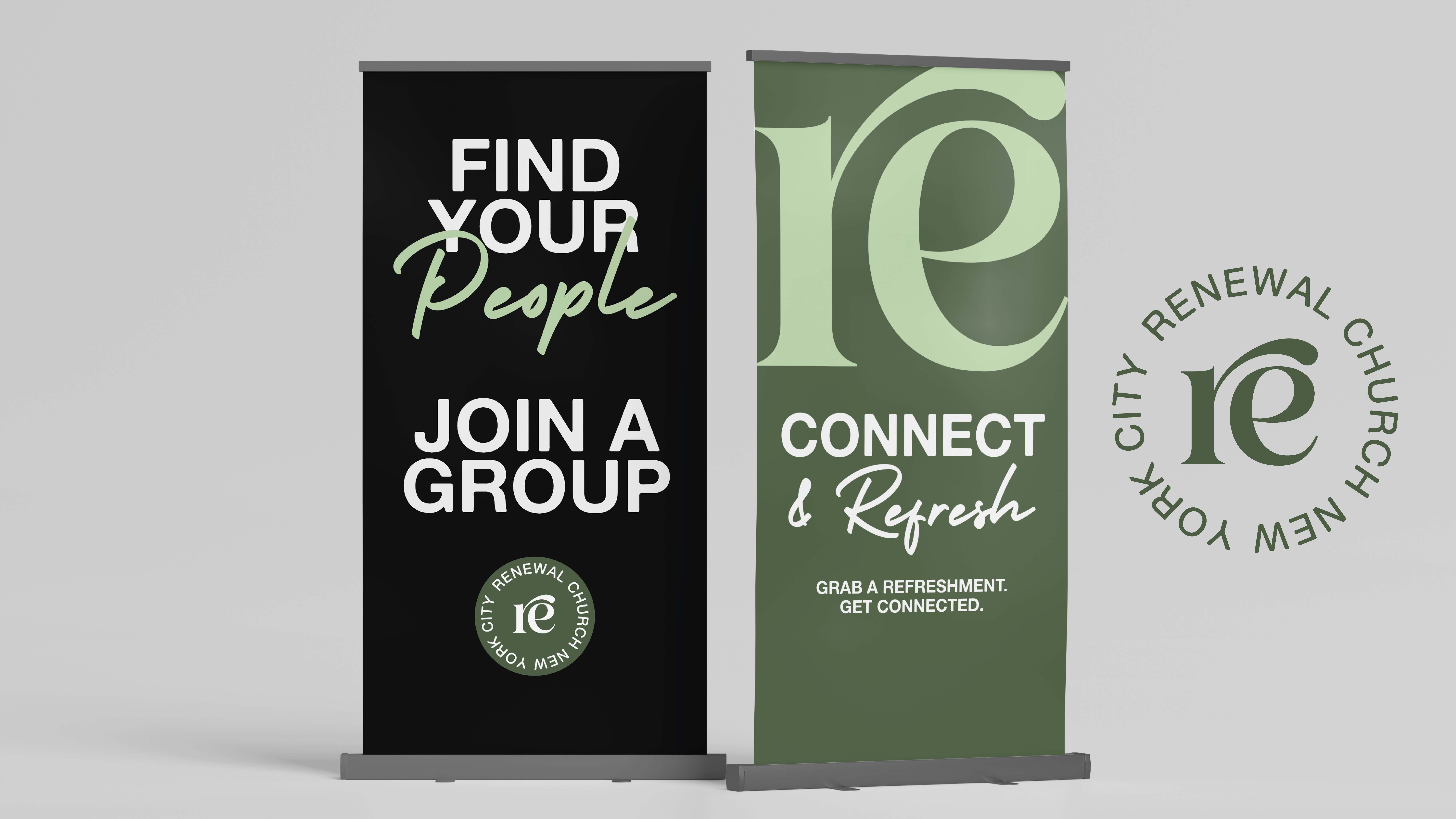 A defining choice was the use of green as a primary brand color—symbolizing new life in Christ while also connecting visually to the stunning natural landscape of Central Park, an oasis in the middle of Manhattan. Paired with clean lines and a refined logo system, the brand reflects Renewal’s desire to bring the timeless truth of the gospel into the fast-paced, ambitious culture of New York City.